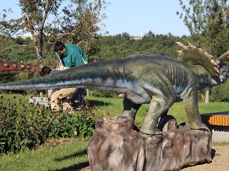 The second is sculpting dinosaurs. His production technology and materials can be divided into two types: 1. FRP material; 2. Cement sculpture. The dinosaur's skeleton was made of steel, with the skin of a fibreglass and cement sculpture attached. Such dinosaurs can be made into different poses, lifelike. But he can't move mechanically. He's a fixed dinosaur sculpture.